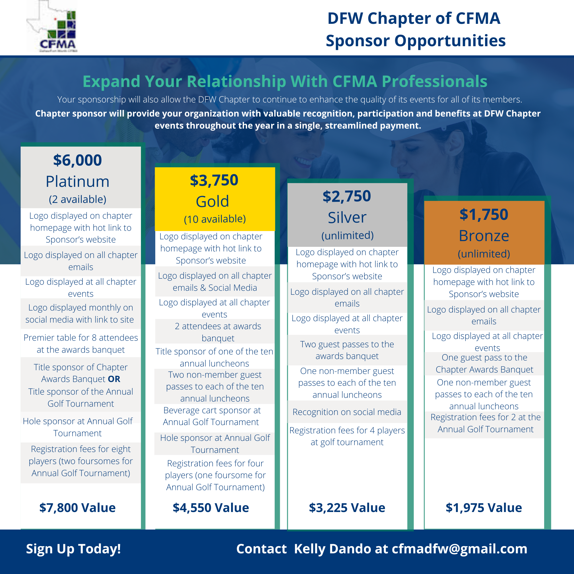 The CFMA’s DFW Chapter is pleased to present its Annual Sponsorship Program. Becoming an annual DFW Chapter sponsor will provide your organization with valuable recognition, participation, and benefits at DFW Chapter events throughout the year in a single, streamlined payment. The CFMA is a national organization with over 7,800 members in North America and is the only organization dedicated to bringing together construction financial professionals and those partners serving their unique needs. The DFW Chapter is one of the largest and most active chapters of the CFMA. By becoming a DFW Chapter sponsor, you will expand and strengthen awareness of your company’s brand while demonstrating a corporate commitment to the construction industry. Your sponsorship will also allow the DFW Chapter to continue to enhance the quality of its events for all of its members. Email Kelly Dando at cfmadfw@gmail.com for more information or sign up, please CLICK HERE.