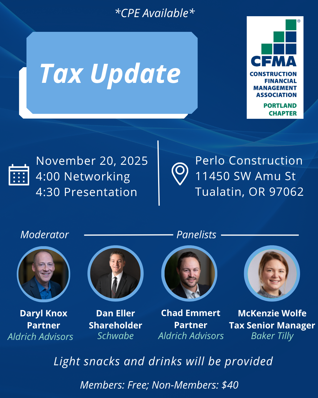 Chad Emmert: Chad joined Aldrich in 2006 and became a partner in 2020. Chad has 20 years of public accounting experience and has been providing his clients with expertise in strategic tax planning, multi-state, and general tax compliance services, as well as business sale consulting and transaction support. He spends his time focusing on construction and construction-related clients. Chad graduated with his Bachelor of Science degrees in Financial Accounting and Business Management from Corban University and is a Certified Public Accountant in Oregon with his CCIFP certification. Chad has presented seminars and classes for AGC, CFMA, ACEC and currently serves as the treasurer for the AGC Foundation.