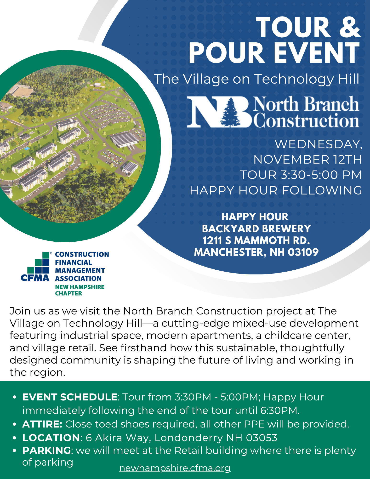 Join the CFMA New Hampshire Chapter for an exclusive Tour & Pour Event hosted by North Branch Construction at The Village on Technology Hill in Londonderry, NH.